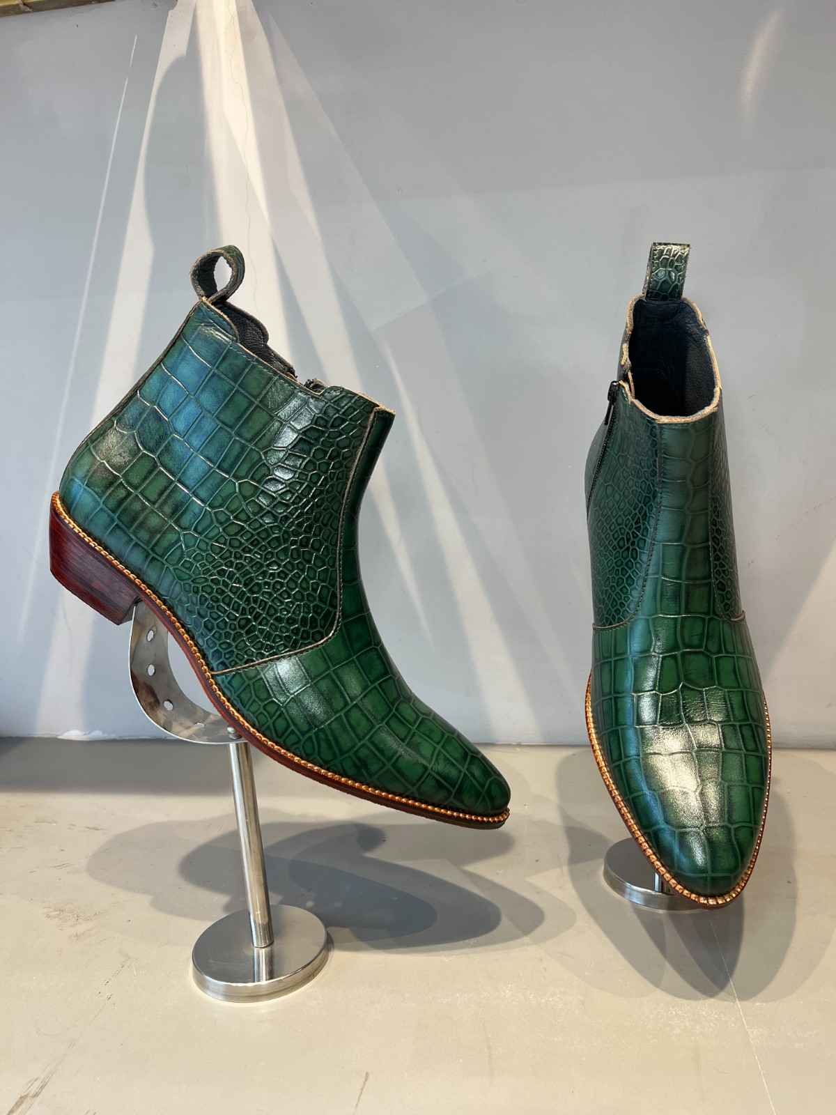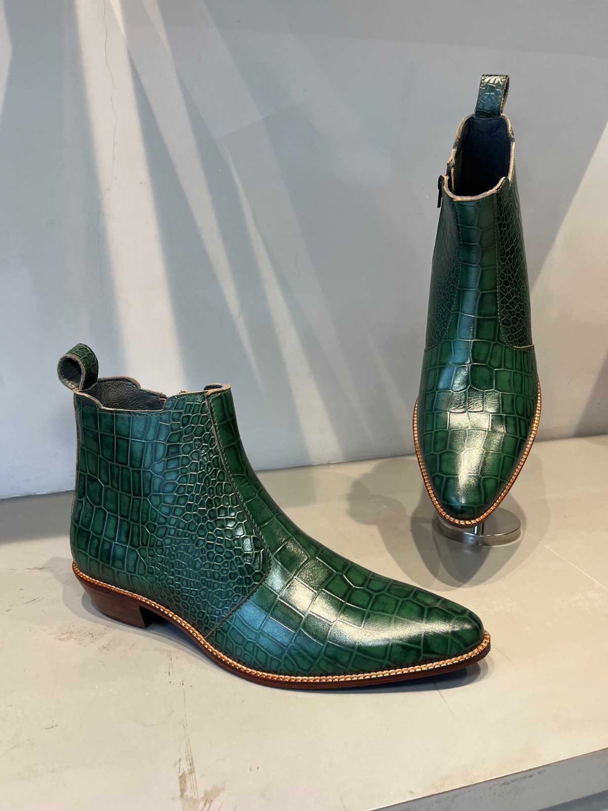 Command attention with the striking allure of our Green Croco Jackson Boots, a fusion of bold design and timeless elegance. Handcrafted from premium leather embossed with an intricate crocodile texture, these boots embody confidence, artistry, and modern sophistication.